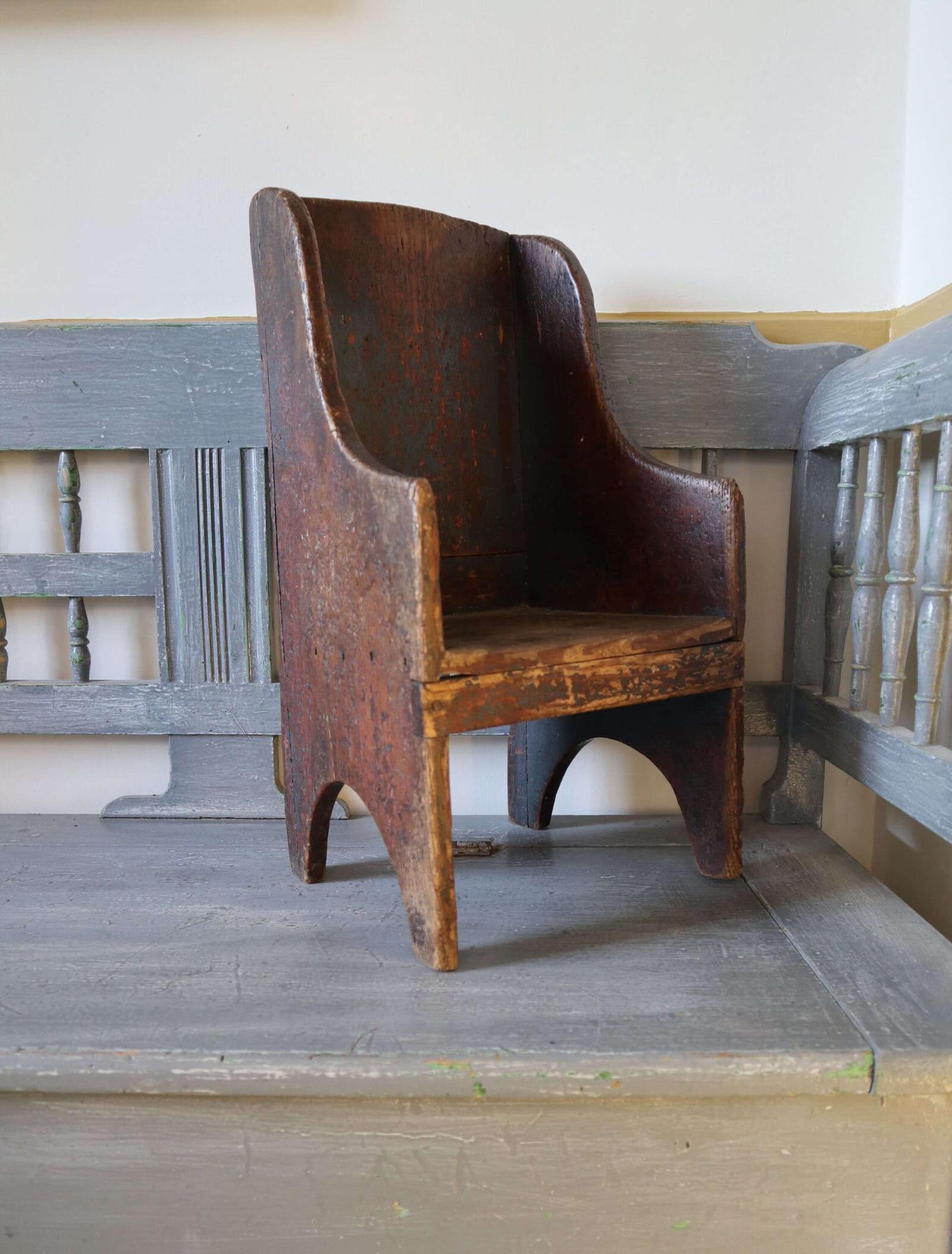 - This little beautiful armchair is a very effective adaptation forming a naively elegant wee armchair for a bairn, based entirely on the standard Scottish boarded panel stool or low creepie design. This one having an extended side and back panels to form the panelled / wing sides like a small version of a lambing chair.