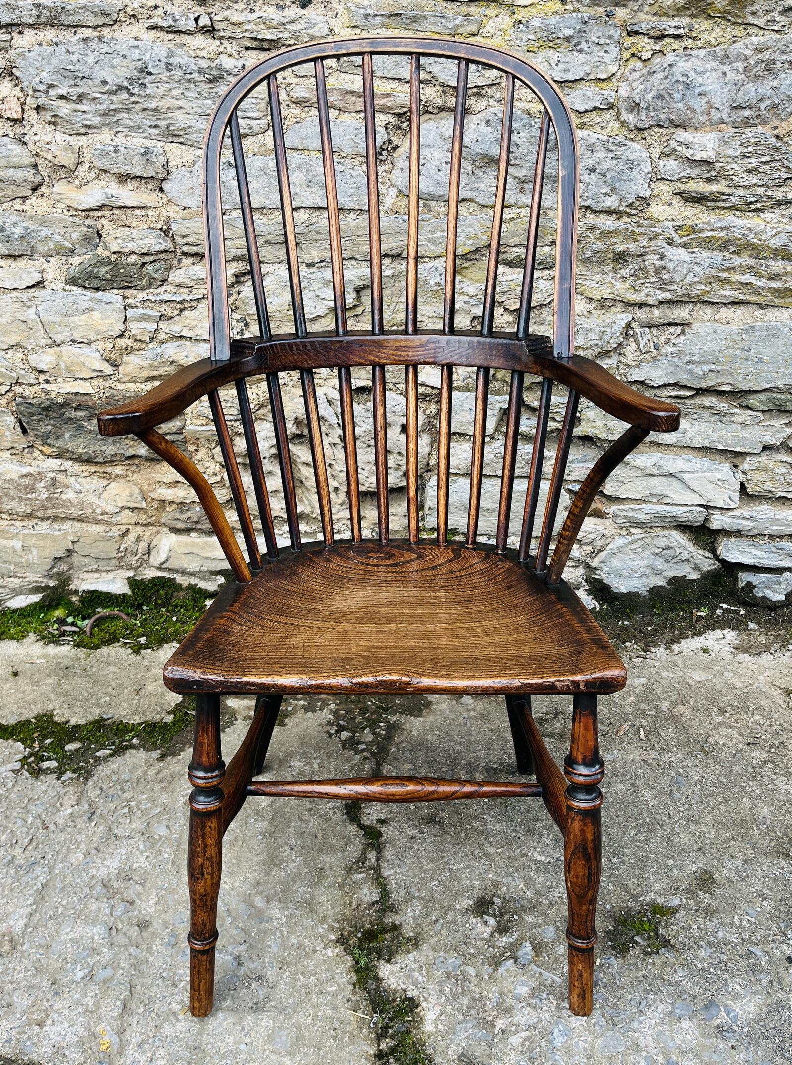 A good example of a primitive Windsor chair, most likely originating from the Westcountry. It has a saddle shaped solid elm seat with a flat front and the hoop back encloses tapered spindles with a three piece arm that curves outwards. The chair stands on four simple turned legs joined by a H-stretcher. It is a good comfortable chair, sturdy and well made.