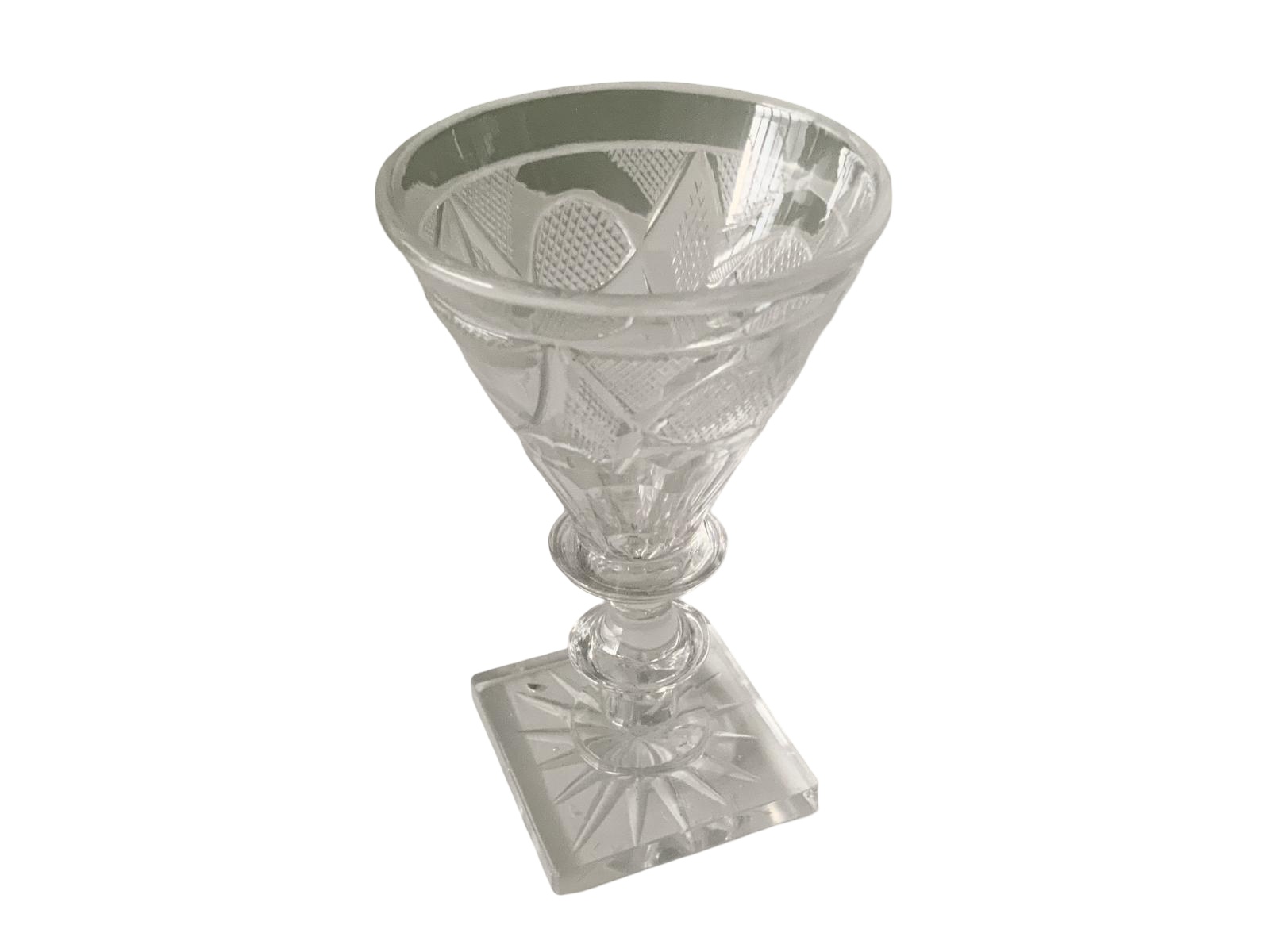 An early 19th century Sutherland glass for wine or cordial. Super cut decoration, panel cutting, double knop and a square base with start cut. The little black mark on the base is where a seed was during the making process. Slight nibbles to the base, which is common with the square base.