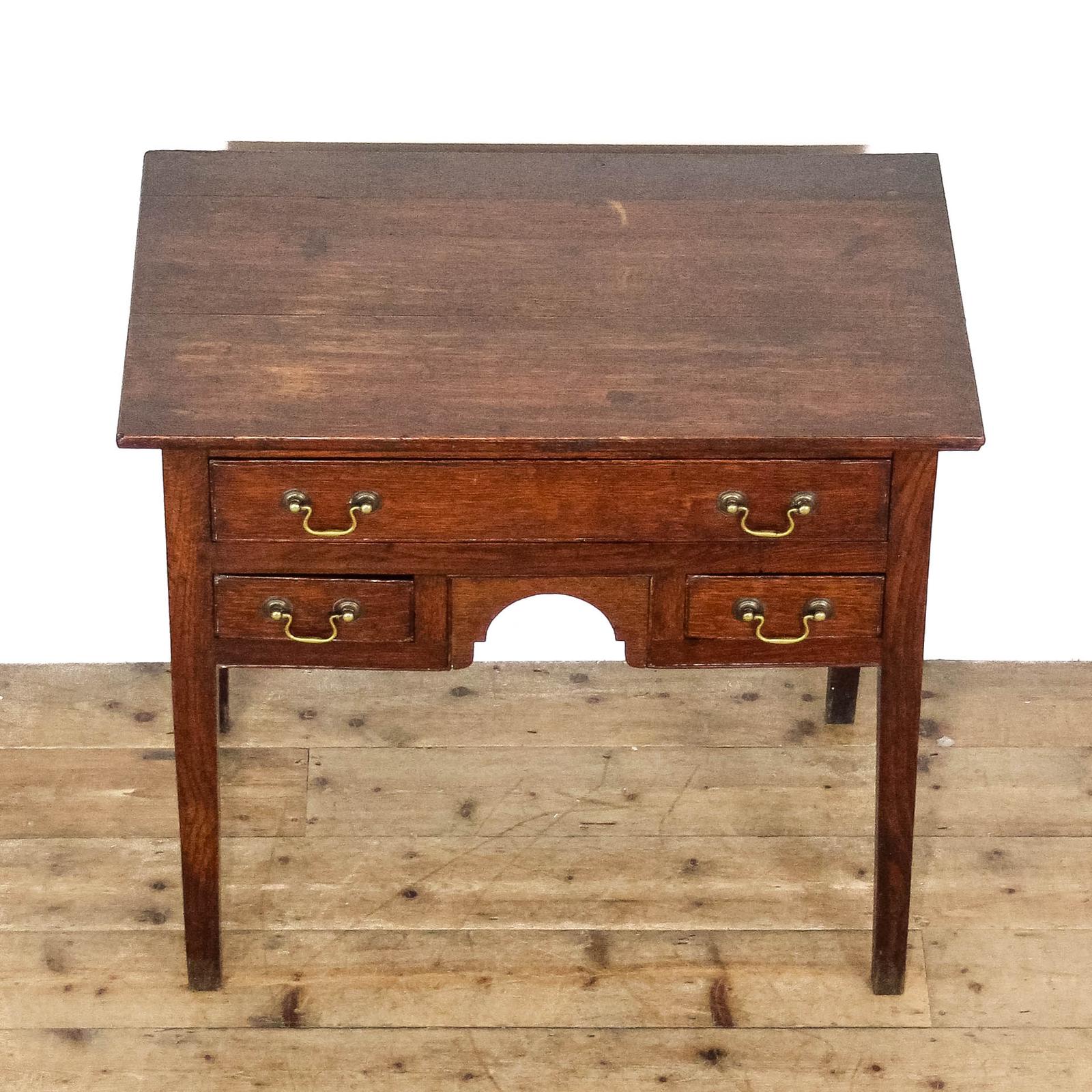 In good antique condition overall, with marks and wear consistent with age and use. There is some loss to the lower edges of the drawer fronts, along with a noticeable gauge to the right hand side. General surface wear, including minor water marks to the top along with some deep scratches (pictured) and light scuffs and marks all commensurate with age. Structurally solid and sound with all drawers running well. A charming piece.