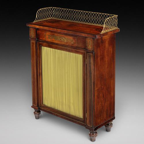 Early 19thC Diminutive Irish Side Cabinet - The oversized gilt brass gallery surmounted onto a rosewood veneered top sits above a gilt brass frieze. The sides are rosewood and the silk pleated door opens to reveal a single shelf. The cupboard door is brass strung to match the brass stringing to the sides - 29"w x 12"d x 38"h