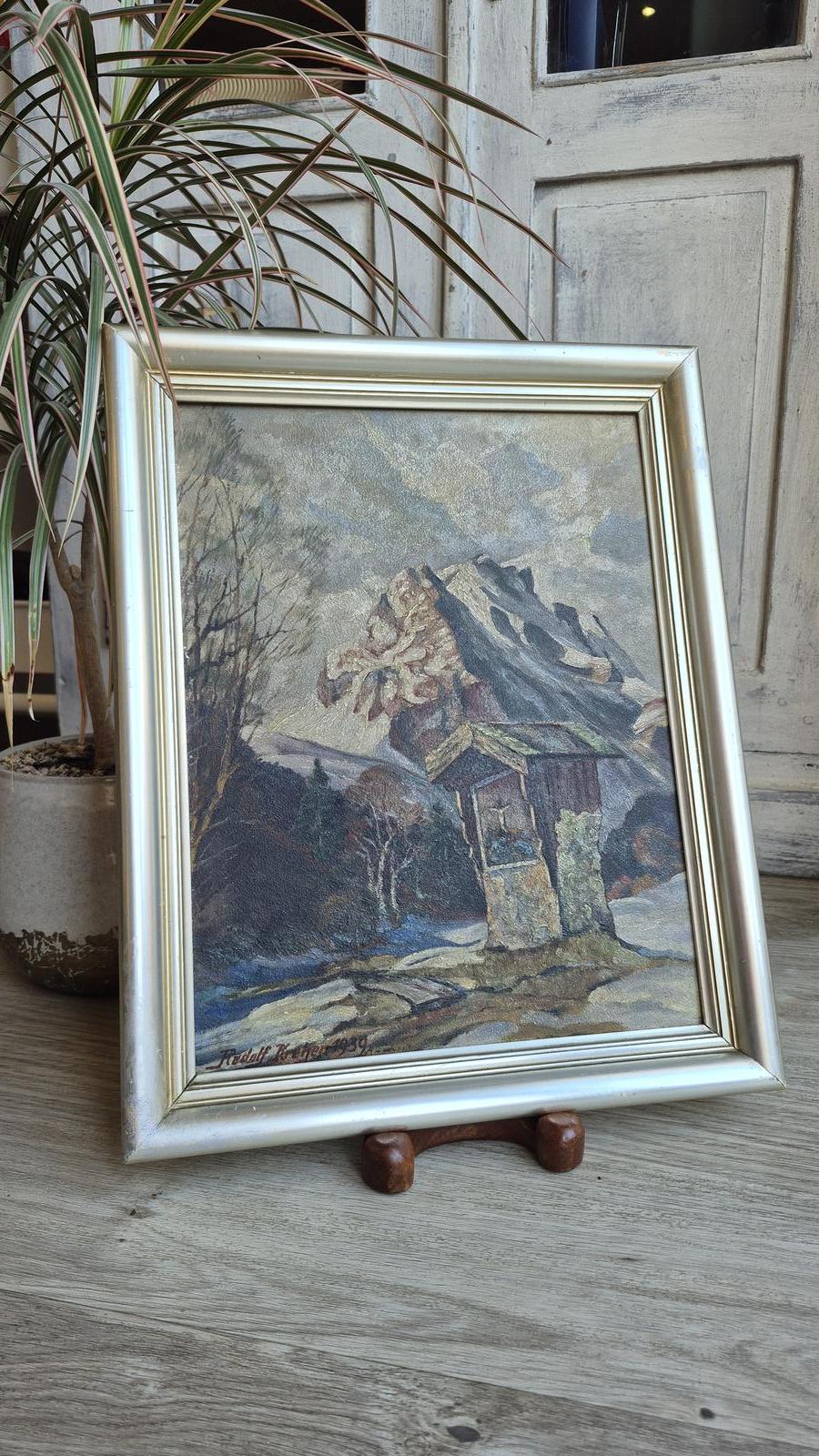 This oil painting on Schmincke board by Rudolf Kreher, dated 1939, depicts a dramatic alpine landscape centred on a small stone wayside shrine or roadside chapel, a motif commonly found in mountainous regions of Central Europe.