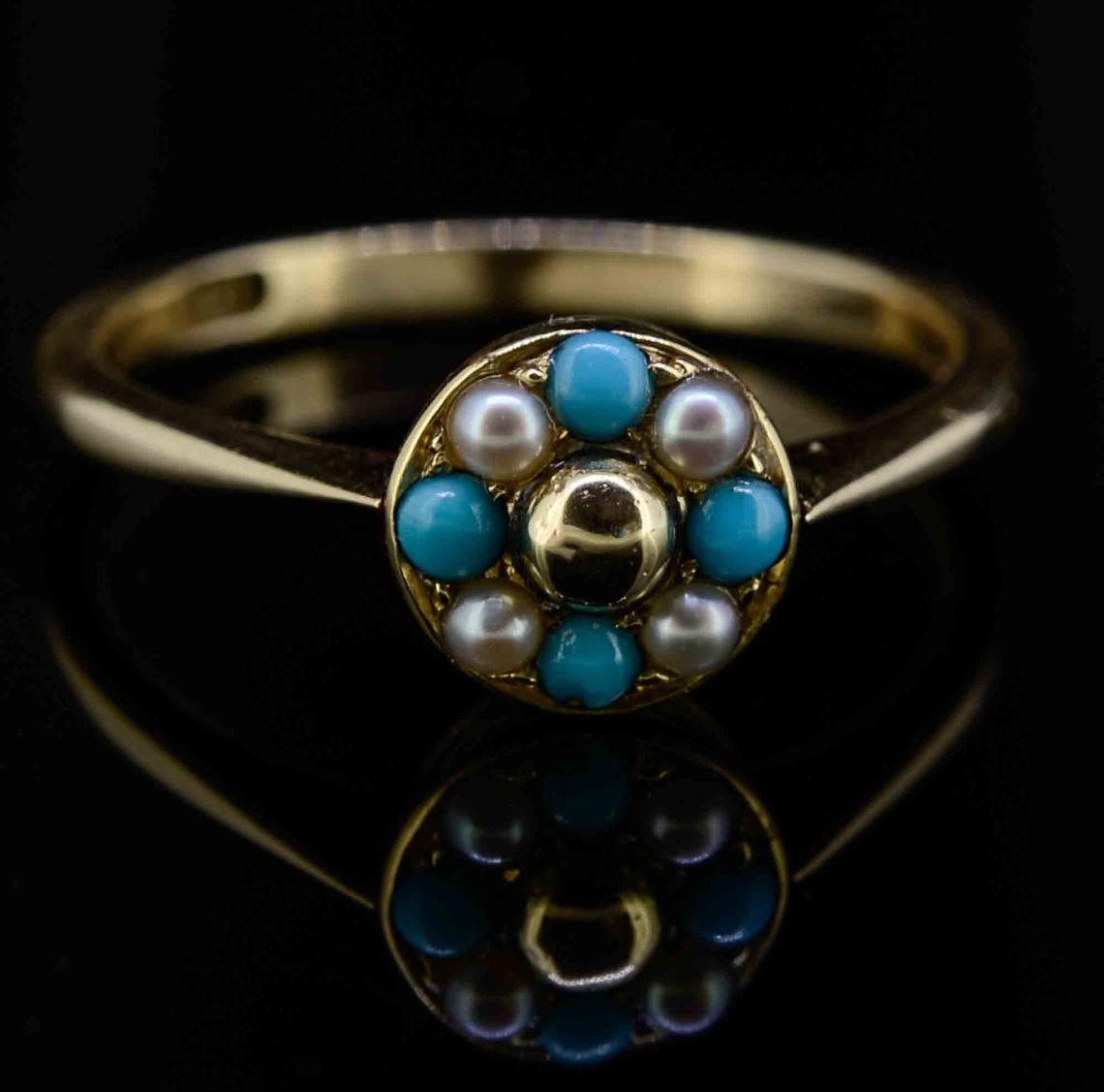 Early 20th Century 9ct Rose Gold Seed Pearl & Turquoise Cluster Ring