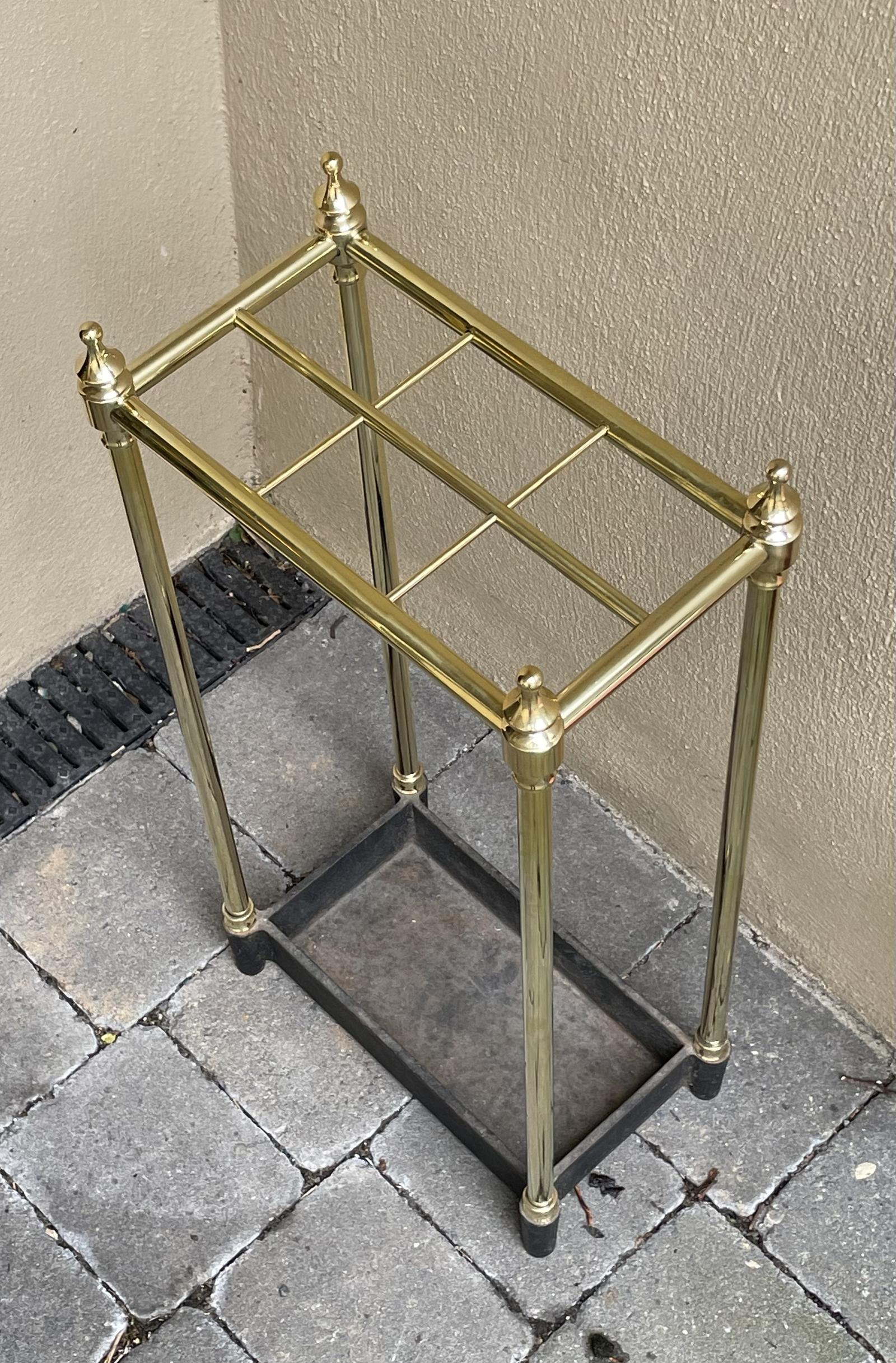 A very smart early 20th century brass umbrella stand with solid brass frame with decorative cast urn shaped finials. Six divisions to hold sticks or umbrellas in position. Cast iron base.