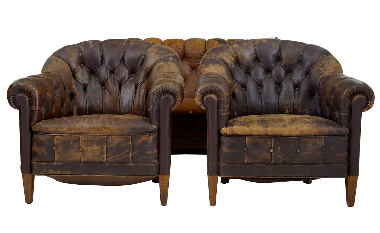 Early 20th Century Button-back Leather 3 Piece Suite for Restoration