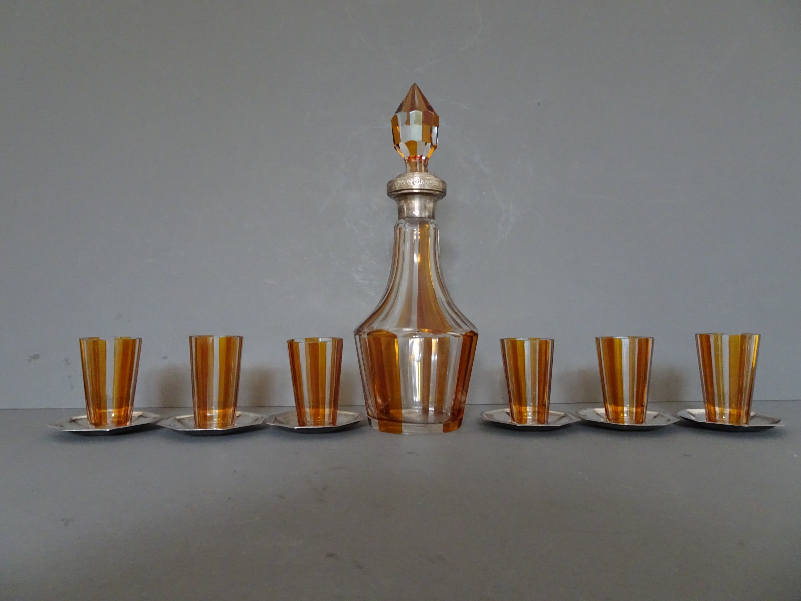Early 20th Century Cased Italian Liqueur Set. Glass. Silver Saucers. Argenterie
