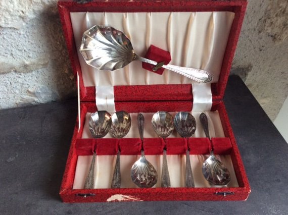 Early 20th Century Cased Set of Silver Plated Epns English 6 Fruit Spoons & Server