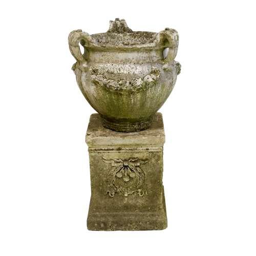 Early 20th Century Decorative Reconstituted Stone Garden Urn on Stone Plinth