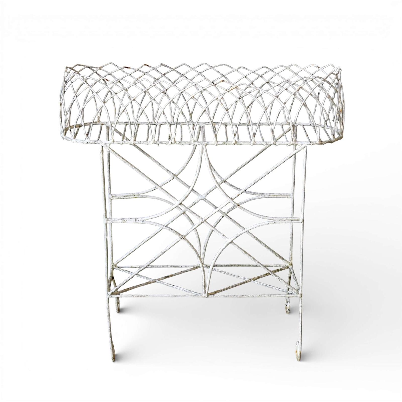 English garden furniture, early 20th century. Wirework stands of this type were commonly used in orangeries, conservatories and garden rooms, where their lightness and decorative patterns complemented potted plants and seasonal displays.