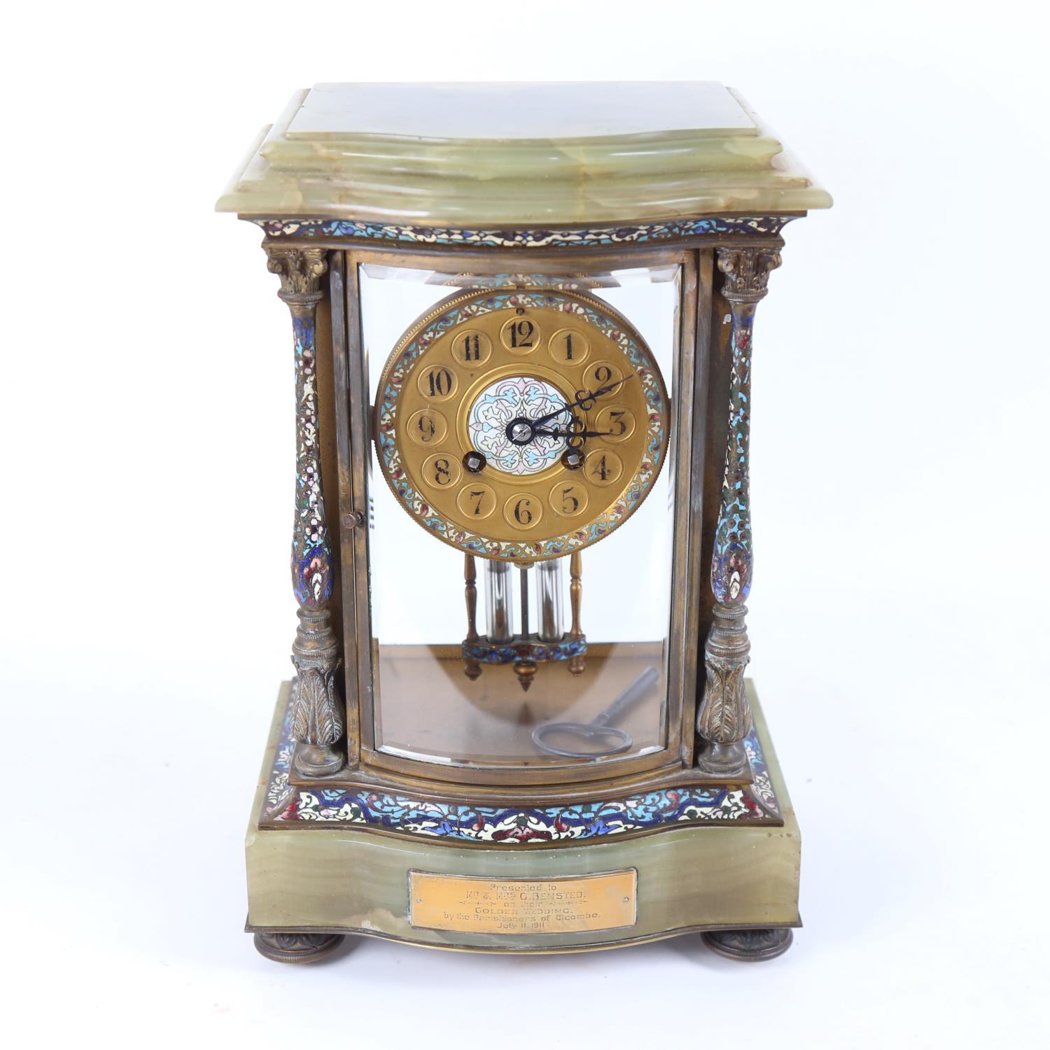 Early 20th Century French Green Onyx & Champleve Enamel 8-day Mantel Clock