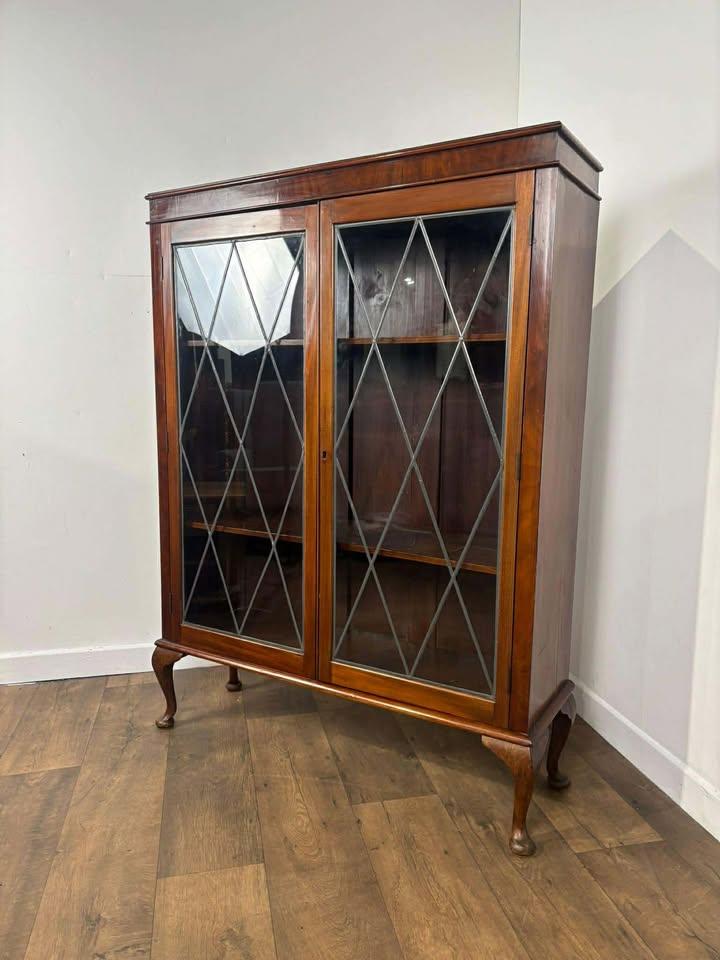 A charming vintage mahogany bookcase of pleasing proportions, featuring elegant Queen Anne–style legs and a warm, rich colour throughout. The overall form is simple and balanced, allowing the quality of the timber and the graceful stance to take centre stage.