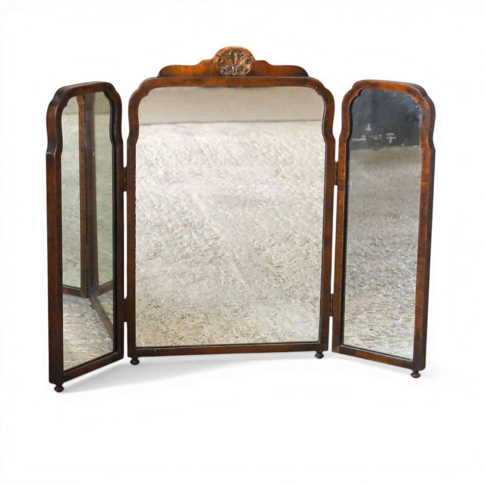 The mirror is thoughtfully constructed with mahogany frames and oak backs, creating a pleasing contrast of tone and grain. It stands on small bun feet, giving it a light, well‑balanced presence. The folding side mirrors allow for adjustable angles, making the piece both functional and visually engaging.