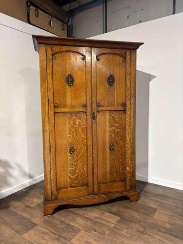 A handsome Early 20th Century oak wardrobe of sturdy form and fine proportion, displaying a beautiful warm colour and mellow patina developed over decades. The twin panelled doors are enriched with decorative mouldings and carved floral roundels, lending a subtle Gothic revival charm.