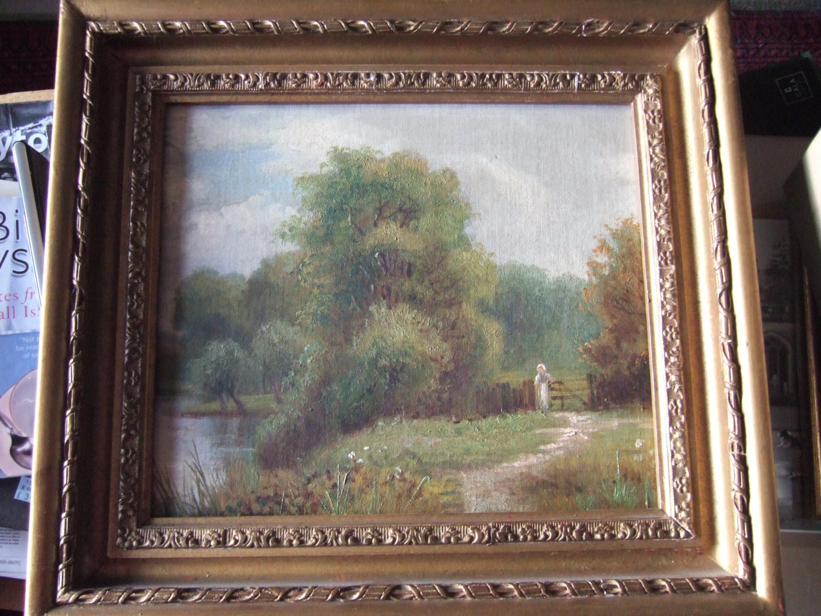 Early 20th century oil painting on board of young woman in rural landscape (1 of 5)