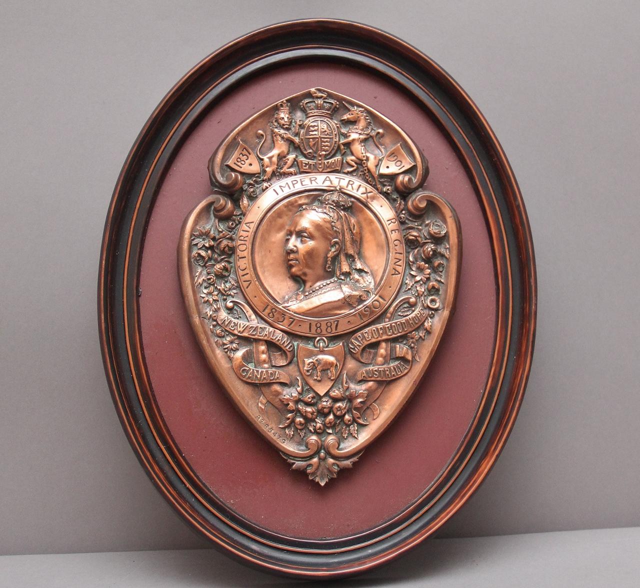 Early 20th Century Queen Victoria Commemorative Jubilee Plaque in a later oval frame, the copper plaque features a profile bust of Queen Victoria in her later years, often referred to as her "Jubilee Head", the plaque is inscribed "Imperatrix Regina" Latin for "Empress and Queen," reflecting her titles, the dates showing 1837 - 1887 marking her fifty-year reign, while the upper corners are marked 1837 (accession) and 1901 (death), suggesting this specific version may have been issued or updated as a memorial piece shortly after her passing. The bottom border prominently lists major British Empire territories of the time: New Zealand, Canada, Australia, and Cape of Good Hope.