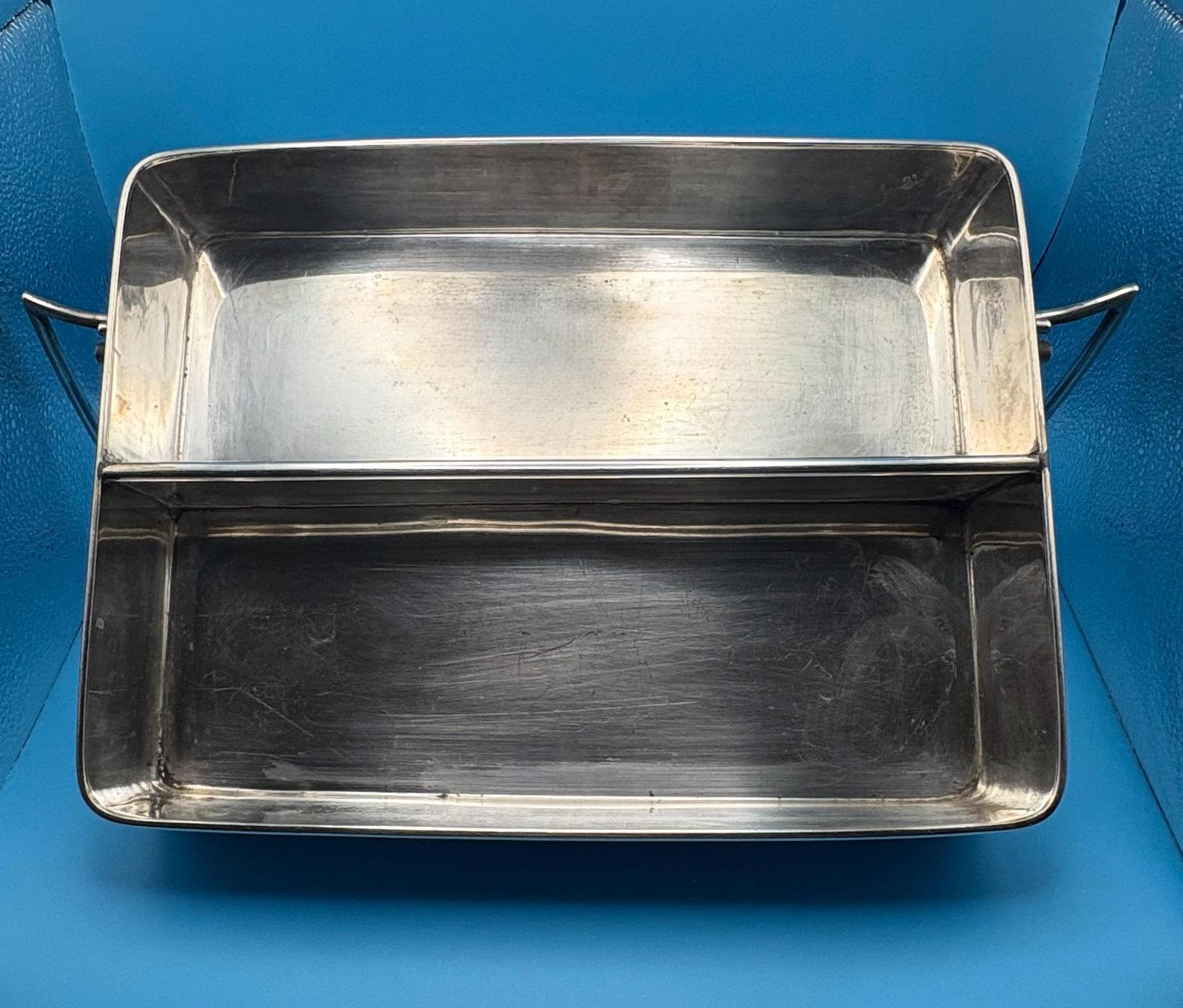 This is a very rare and interesting item in antique silver plate. It is rectangular with a central divide and 2 hinged handles that allow the tray to stand at an angle, making it a very elegant table placement. While commonly refereed to as 'knife trays' today, this item was referred to both as 'knife trays' and 'bread trays' in period literature. Bread is much more likely the original intended use. This is a fine example made by Asprey of London around 1910-1920. This magnificent serving tray measures 30cm long by 5.5cm deep by 22.5 cm wide. The moveable handles add a further 3.5cm to the length of the tray at each end (making a total length of 37cm)