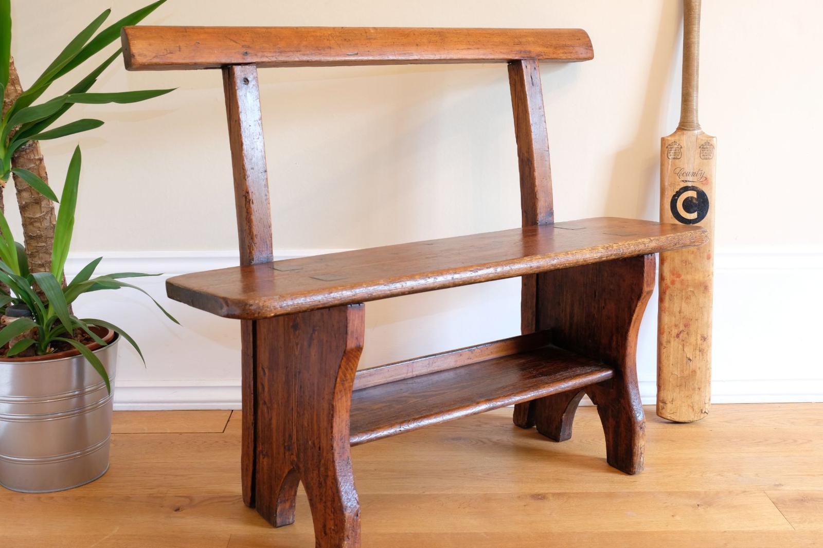 Early 20th century stained pine child's bench with back rest & shoe shelf
