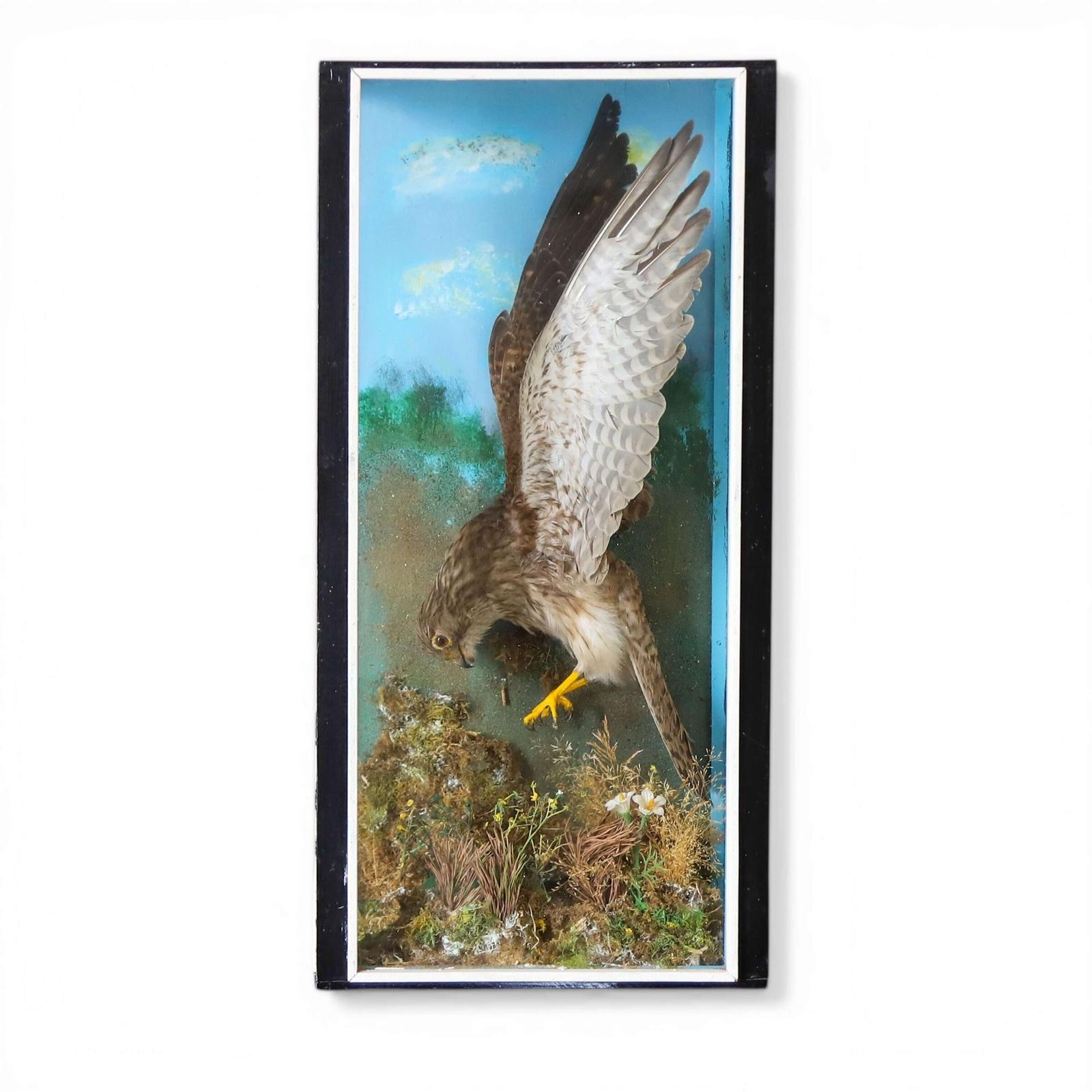 A striking early‑20th‑century taxidermy kestrel diorama, dating from around 1930 and presented within a painted pine and glass case. Executed in the style of Hutchings, this atmospheric display combines natural history with strong decorative presence.