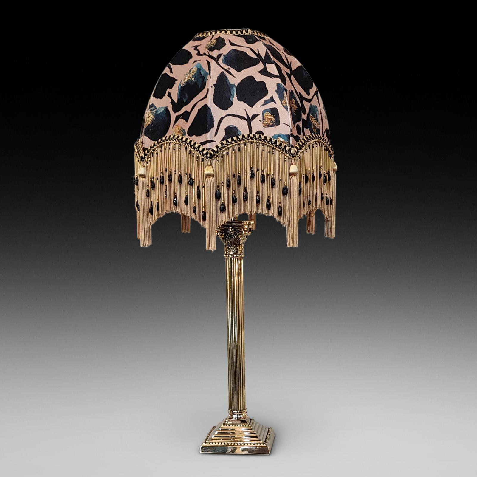 Early 20thC Pressed Brass Corinthian Column Table Lamp with reeded column on stepped square base, converted from oil lamp - 10" diam x 26"h - The lampshade(s) are newly handmade silks by the same maker as provides the shades for Downton Abbey - all lights and lamps have been rewired with authentic corded flex, fitted with either foot switch or finger clicker switch and are Pat tested
