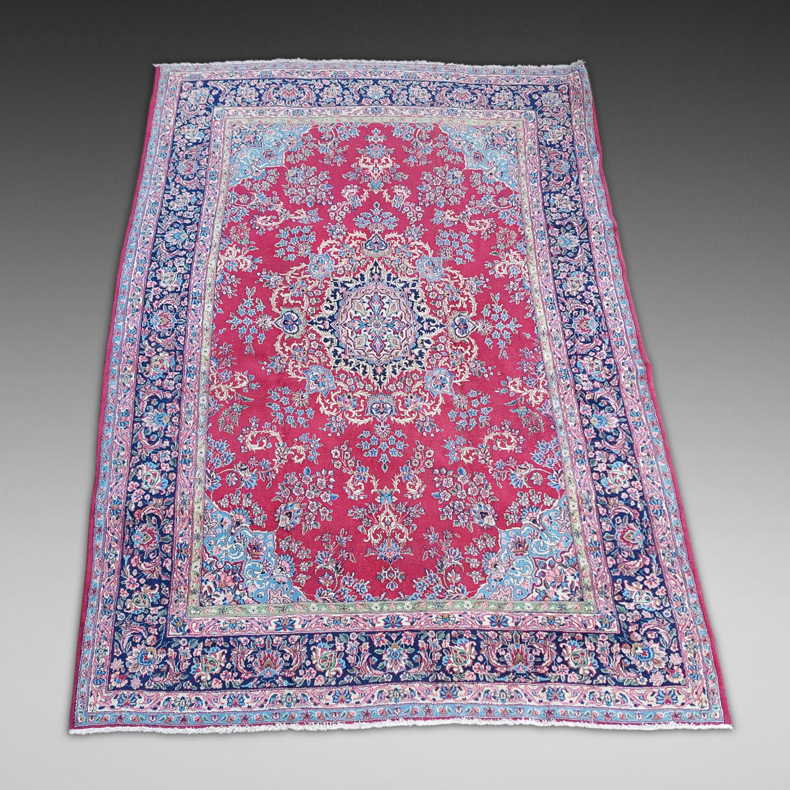 Early 20thC Persian Heriz hand woven wool floor carpet rug. The carpet having a central intricately decorated floral medallion, all enclosed within a red and light blue central panel. Series of graduating outer borders with similar motifs - 144" x 71" approx