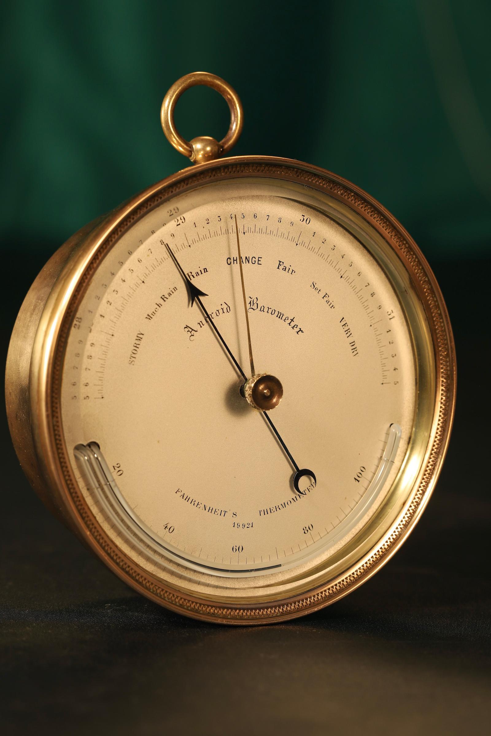 Aneroid barometer having 4½” silvered and engraved dial, the upper part with semi circular barometric scale calibrated in inches of mercury with a range from 27.5” to 31.5” divided down to 1/50”, standard meteorological terms and the legend “Aneroid Barometer,” the lower part marked “Fahrenheit’s Thermometer” with serial no. “19921” below, semi-circular thermometer, the register calibrated in degrees Fahrenheit with a range from 20° to 100°, divided to 2°. Blued steel pointer, deep bevelled glass with gilt index.