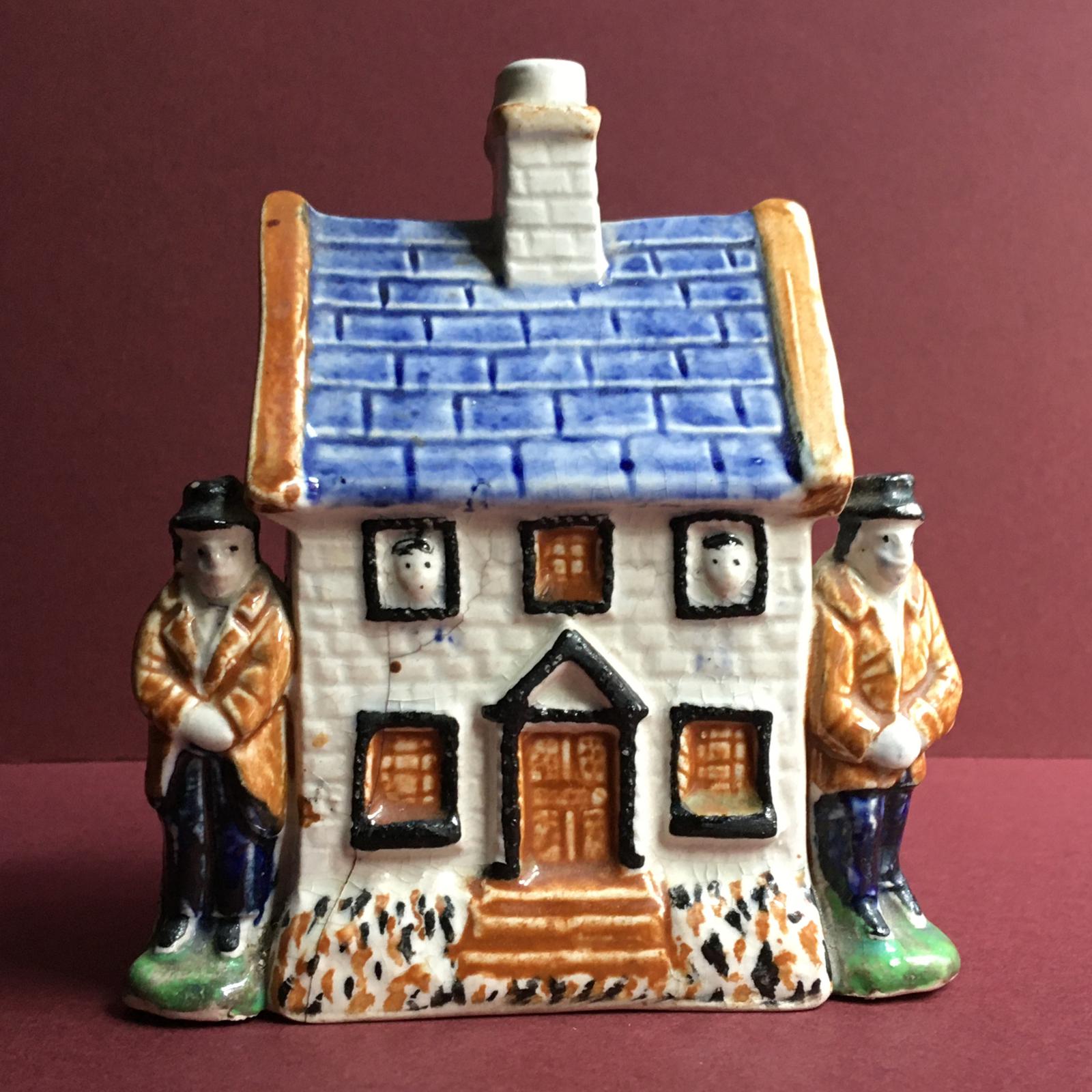 Early Staffordshire Prattware Cottage with Two Faces at the Window & Two Gentlemen at the Door