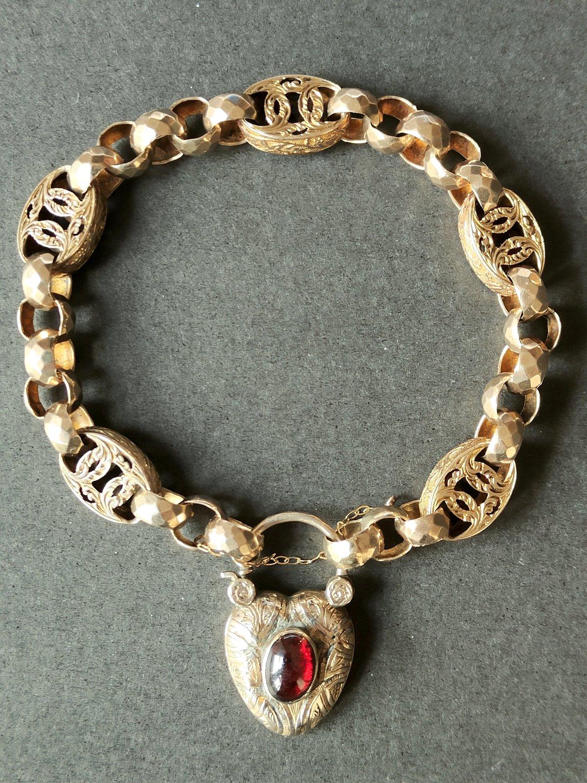 Early Victorian 9ct Gold Bracelet with Garnet Heart Padlock Locket