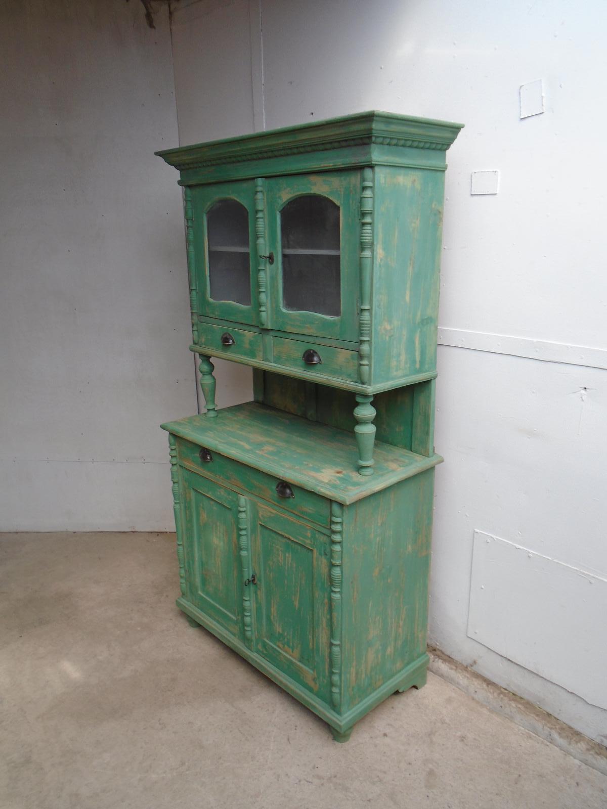 Early Victorian Antique Pine Green & Grey 2 Piece Kitchen Dresser