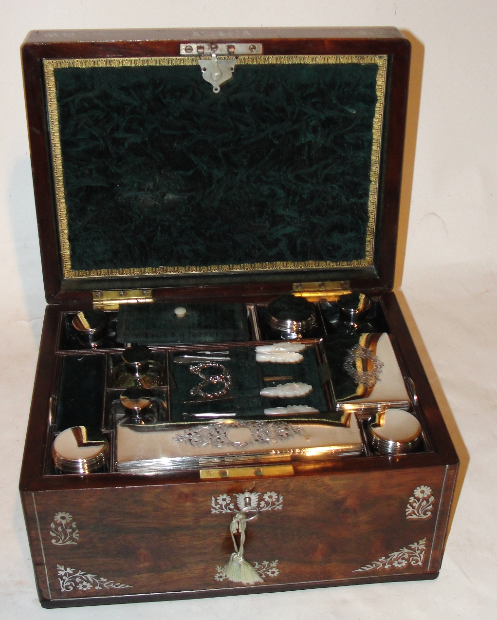 Early Victorian Rosewood Vanity Box, Silver Mounted Bottles