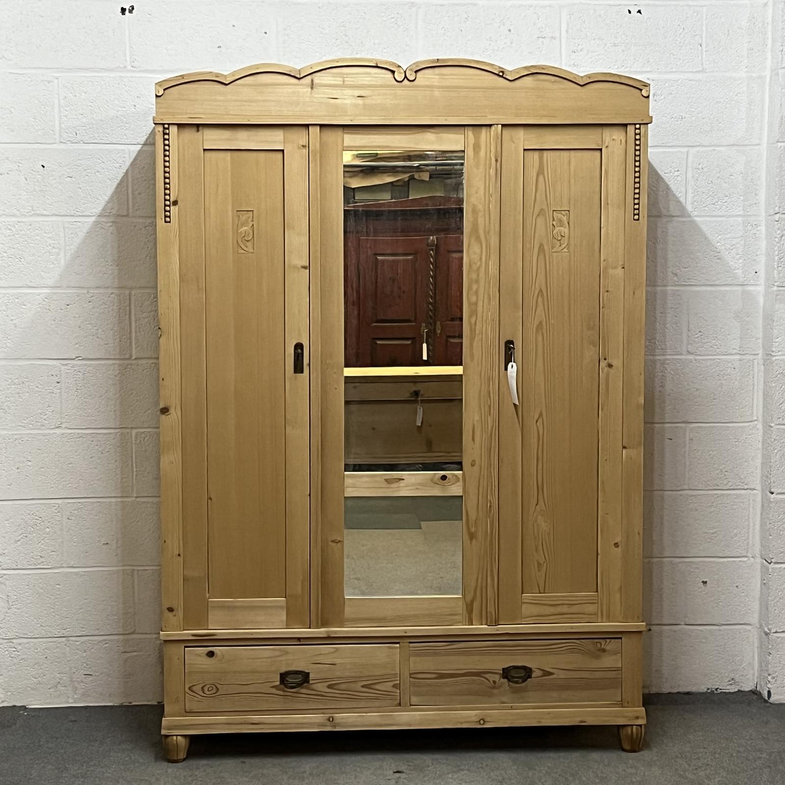 East German 1930's Triple Pine Wardrobe with Mirrored Door - Dismantles