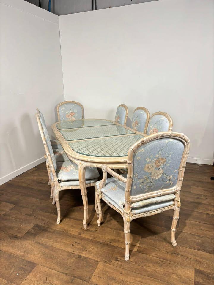 Finished in a soft light cream tone with carved bamboo-effect detailing throughout, the suite has a wonderfully elegant and distinctive look. The chairs are upholstered in a pale blue floral fabric, each supplied with matching loose seat pads, creating a charming vintage aesthetic.
