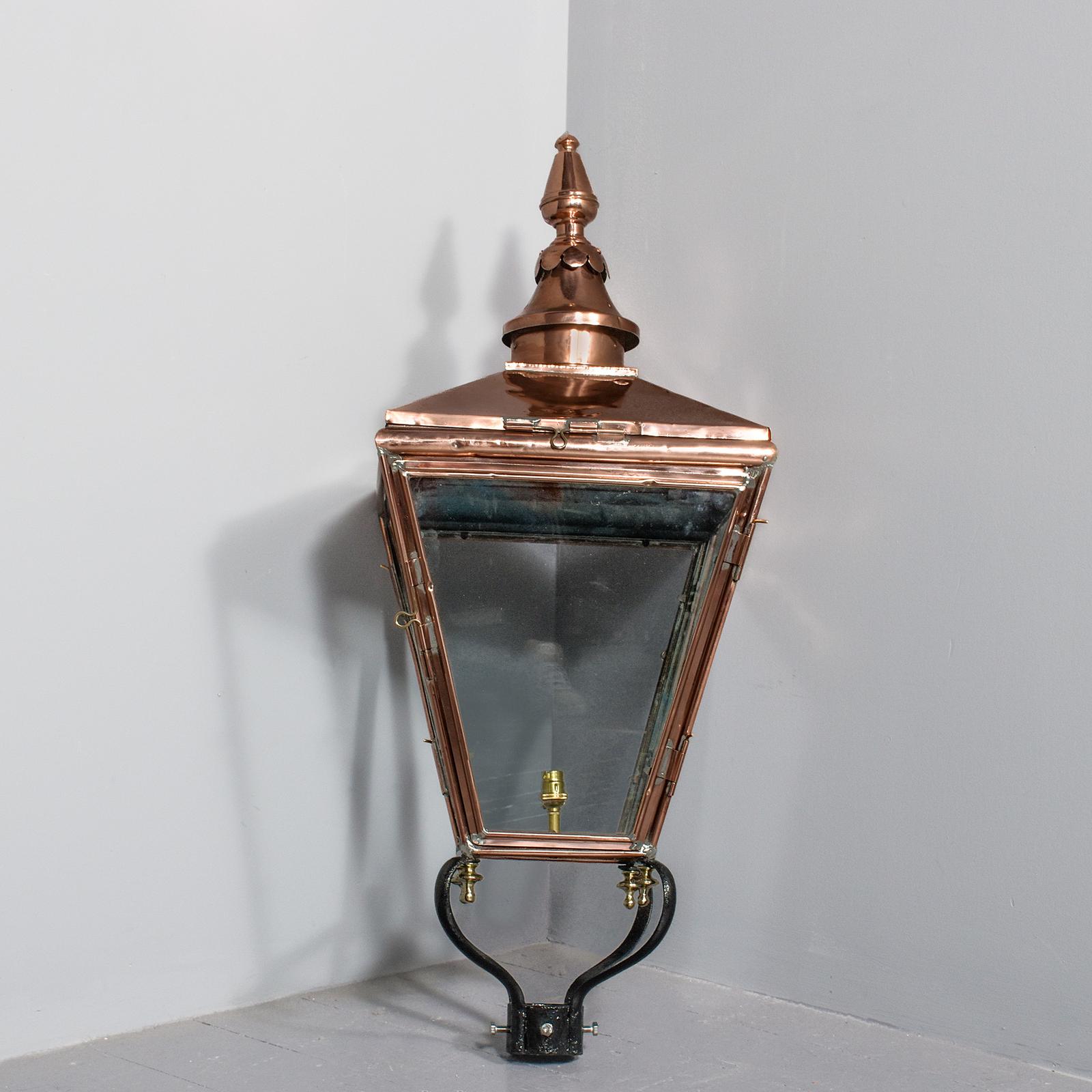 19th Century antique copper and steel Lord Provost Edinburgh street light of typical tapering form, the stylish and elegant finial with a shaped base, the 4 glazed panels, one is hinged for accessing the lamp holder, supported on a cast iron base of four shaped arms locked in position by downward brass finials, recently cleaned and rewired for electricity.