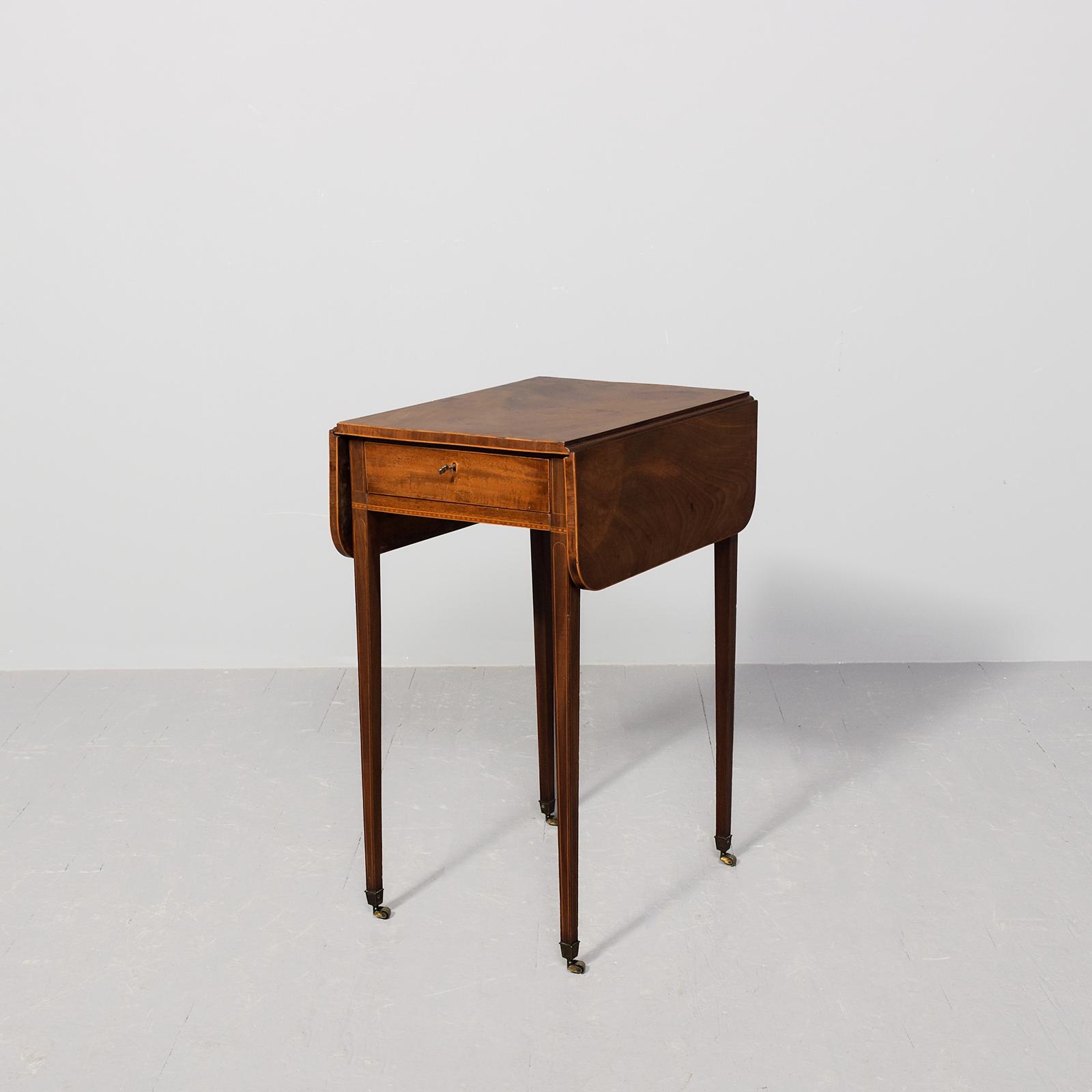Late George III mahogany Pembroke/work table by 'Bruce and Burns of Edinburgh'. The diminutive table with finely figured mahogany top with string inlay, two flaps with rounded corners, held open by wooden hinges, with a full-length drawer with a heraldic escutcheon, the top of the drawer with the name clearly stamped, beneath the drawer, there is a chequered inlay, resting on four elegant square tapering legs with string inlay including an arched top, finishing on a brass cup and original brass castors.