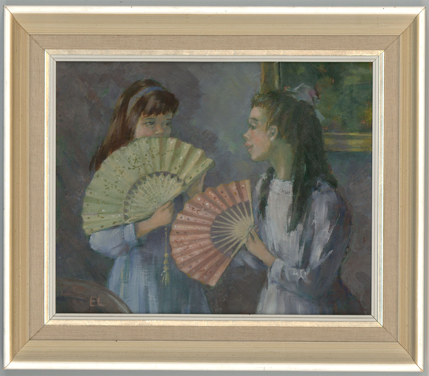 Edith Lawson - Signed Contemporary Oil, Girls in An Interior with Fans