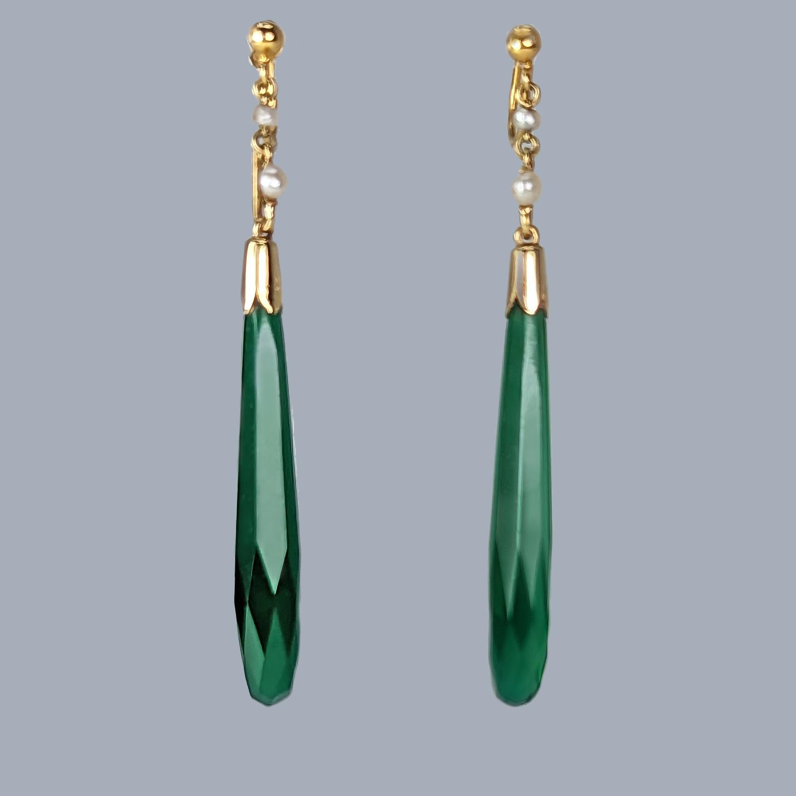 Edwardian 15ct Gold Dangle Earrings | Antique Green Quartz & Pearl Drop Earrings c.1910 (1 of 6)