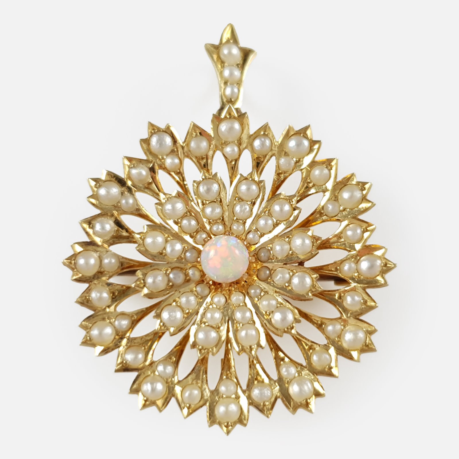 Edwardian 15ct Gold Opal Cabochon Seed Pearl Pendant and Brooch