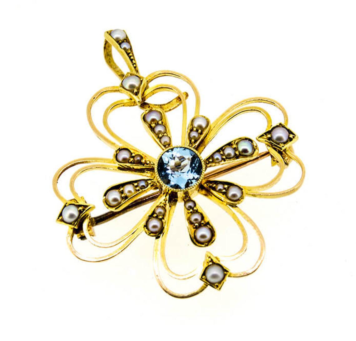 Edwardian 15ct Yellow Gold Aquamarine & Pearl Pendant / Brooch