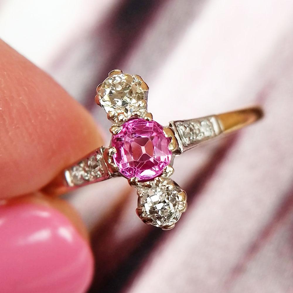 Edwardian 18ct Gold Pink Sapphire & Old Cut Diamond Upfinger Ring