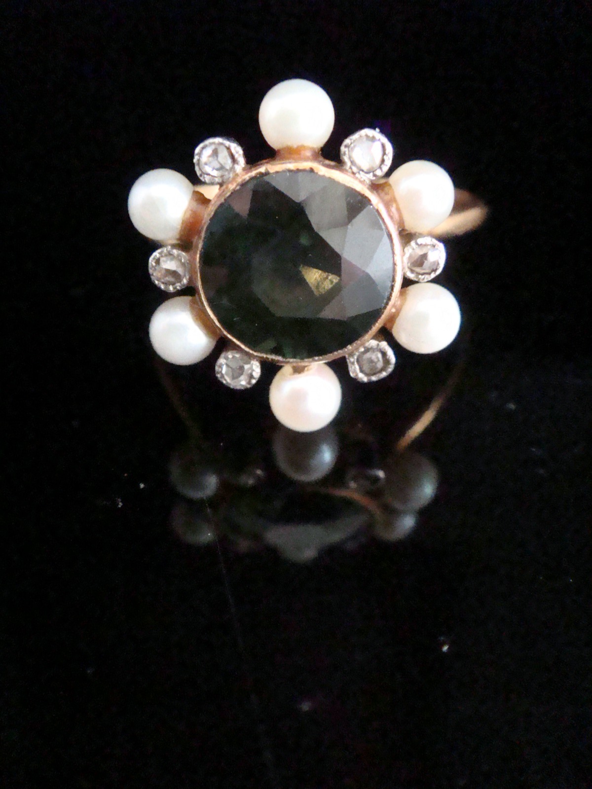 Edwardian 18ct Yellow Gold Green Tourmaline, Seed Pearl and Diamond Cluster
