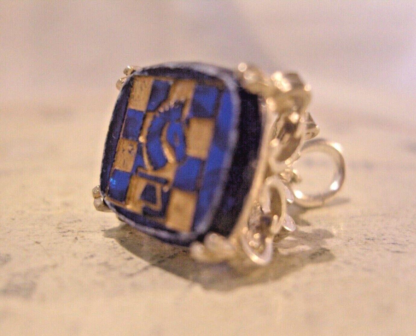 Edwardian 1910 Pocket Watch Chain Silver Fob Antique Large Blue & Gold Glass Chess Knight Fob