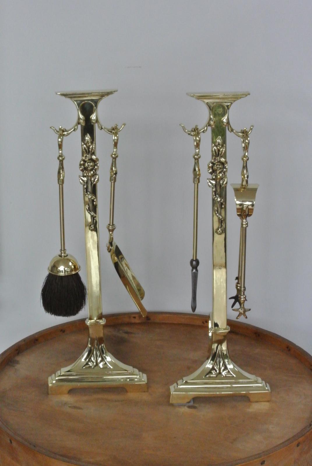 Edwardian 4 Piece Brass Companion Set Fire Tools on Stands