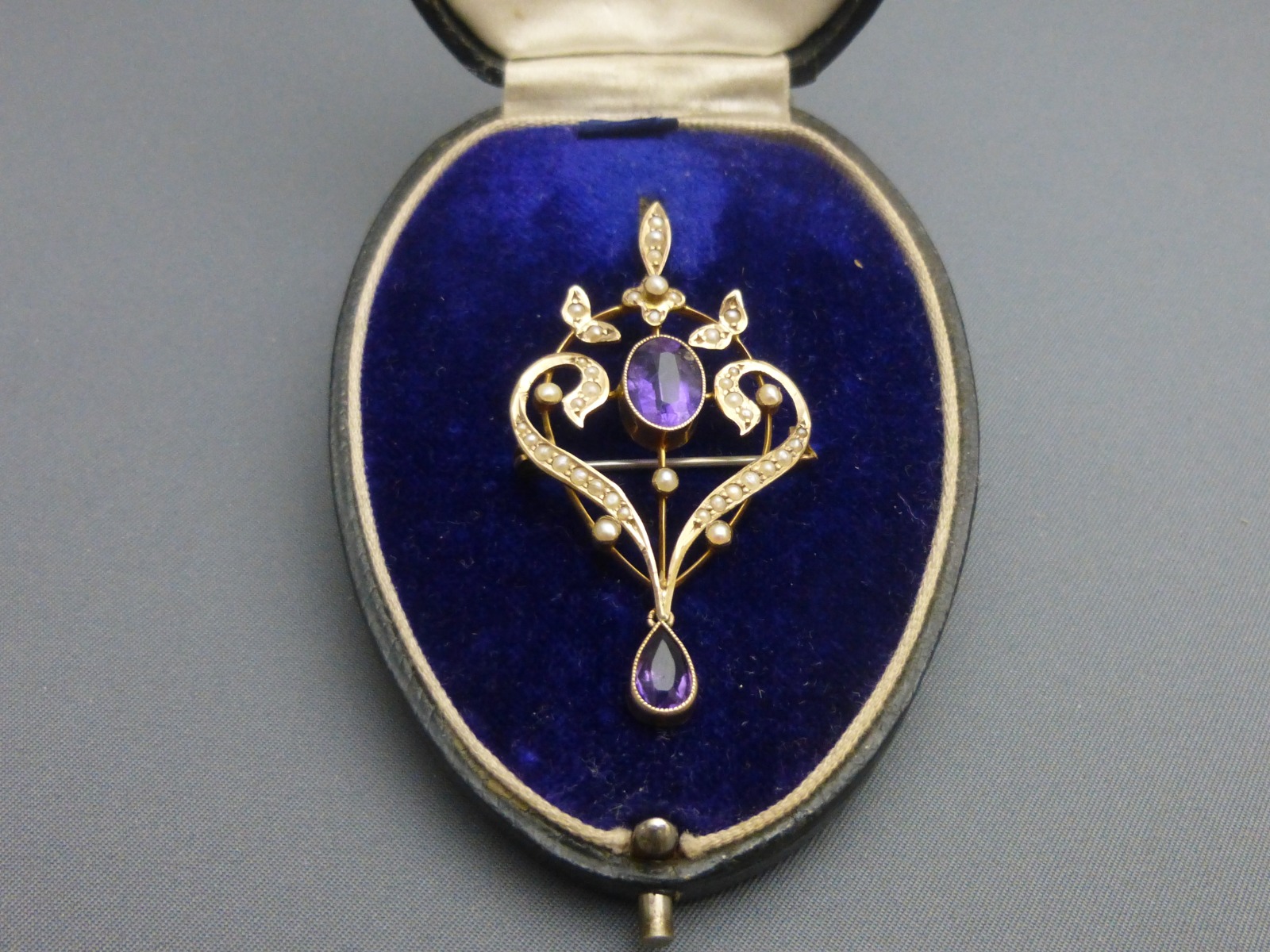 Edwardian 9ct Gold, Amethyst & Pearl Brooch / Pendant