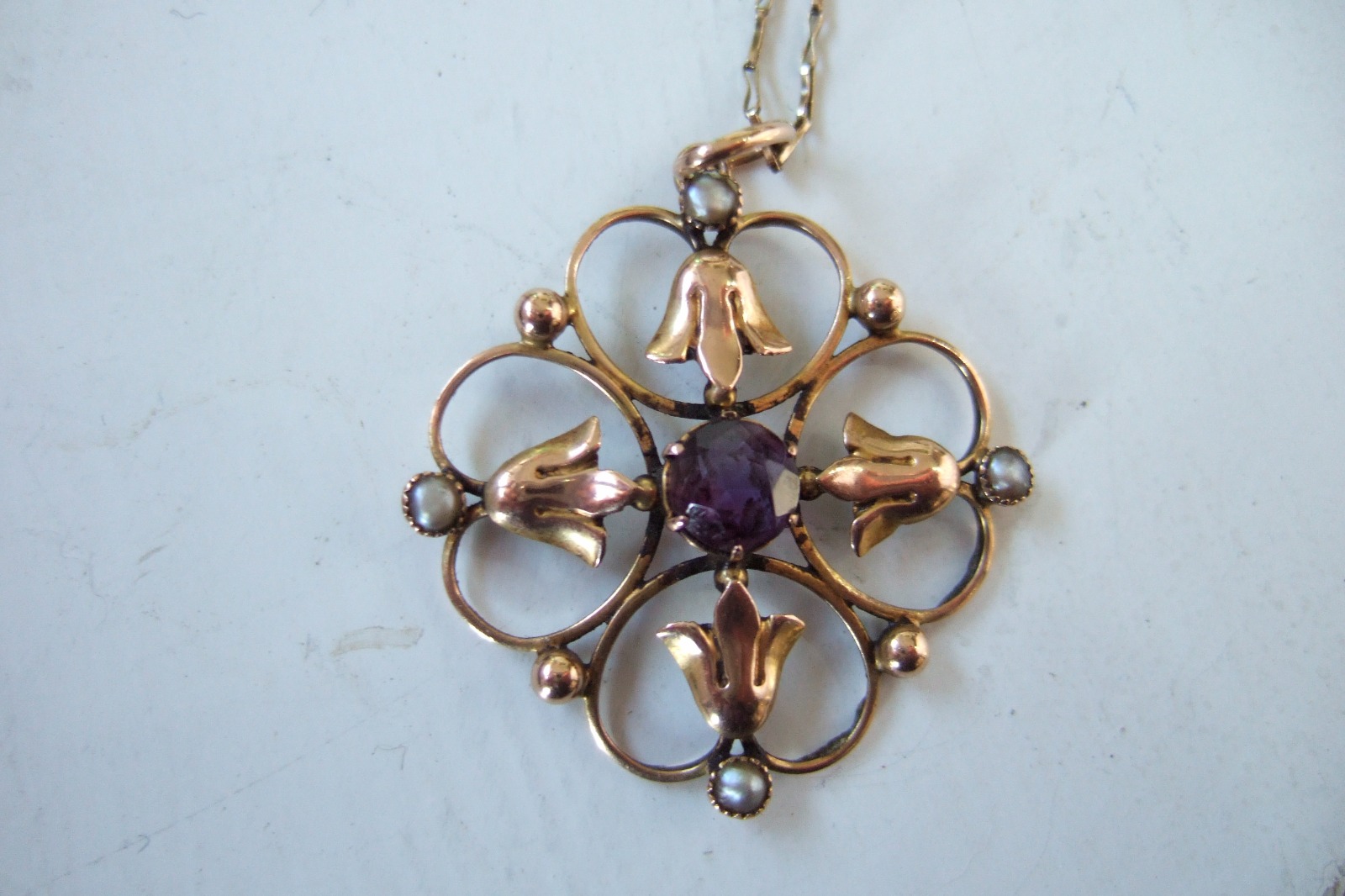 Edwardian 9ct Gold Antique Pendant with Central Amethyst On Fine Gold Chain (1 of 1)