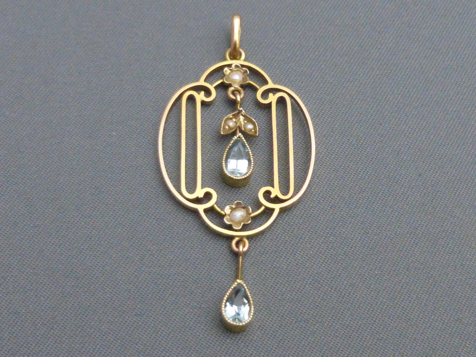 Edwardian 9ct Gold, Aquamarine & Seed Pearl Pendant