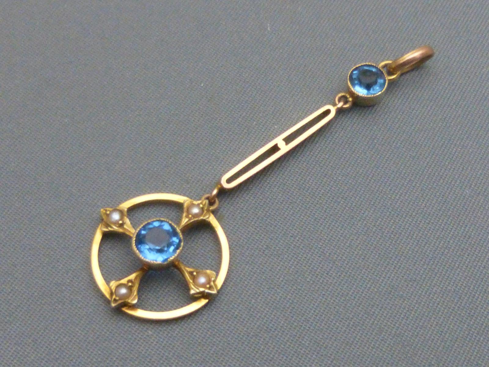 Edwardian 9ct Gold, Blue Zircon & Seed Pearl Pendant