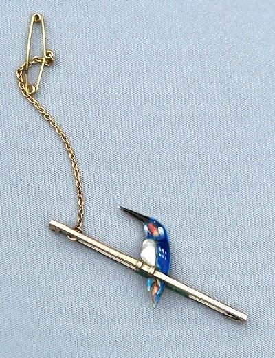 Edwardian 9ct Gold, Enamel & Pearl Kingfisher Brooch