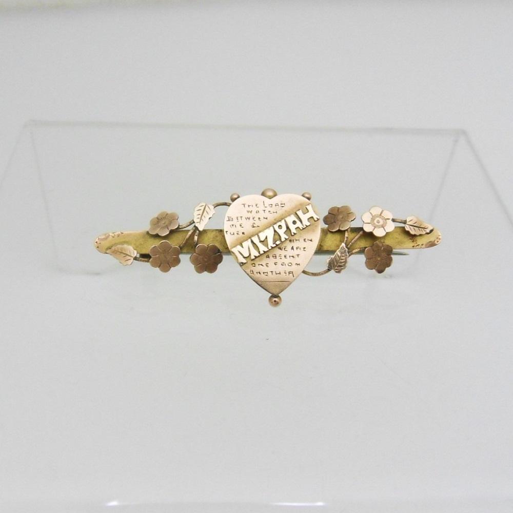 Edwardian 9ct Gold Heart and Flowers Mizpah Brooch 1902