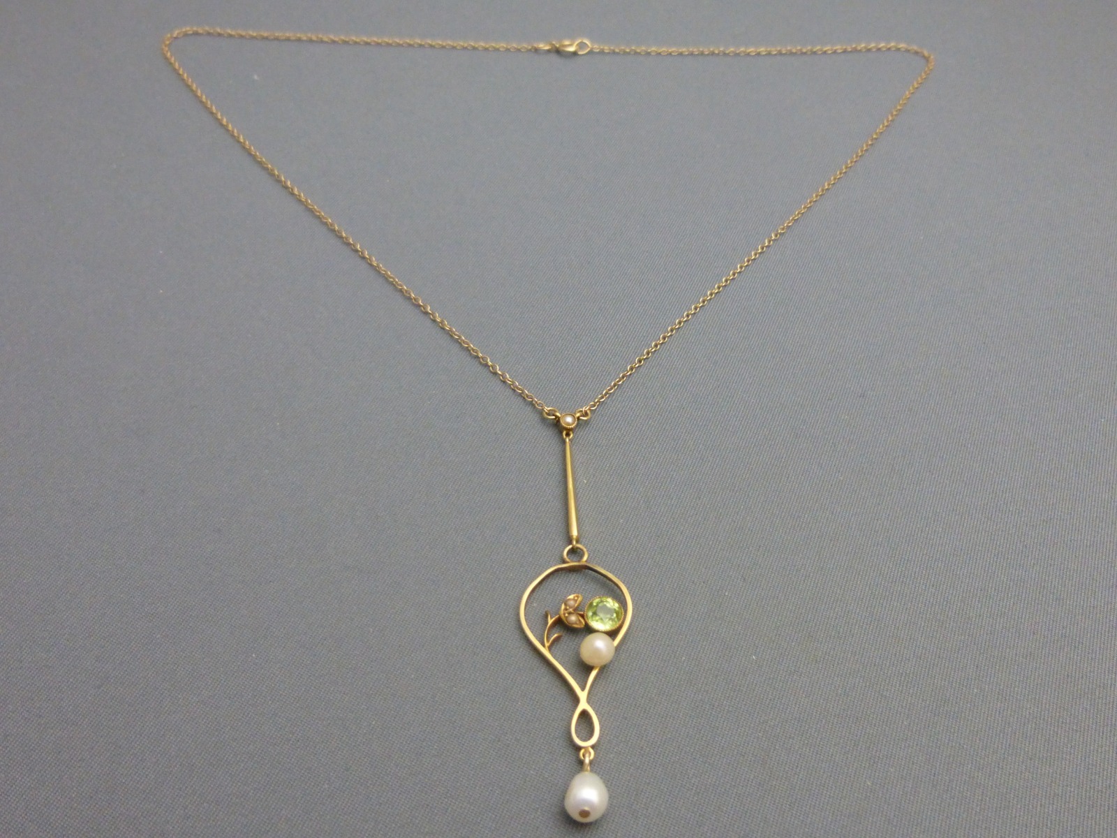 Edwardian 9ct Gold Peridot and Pearl Pendant and Chain