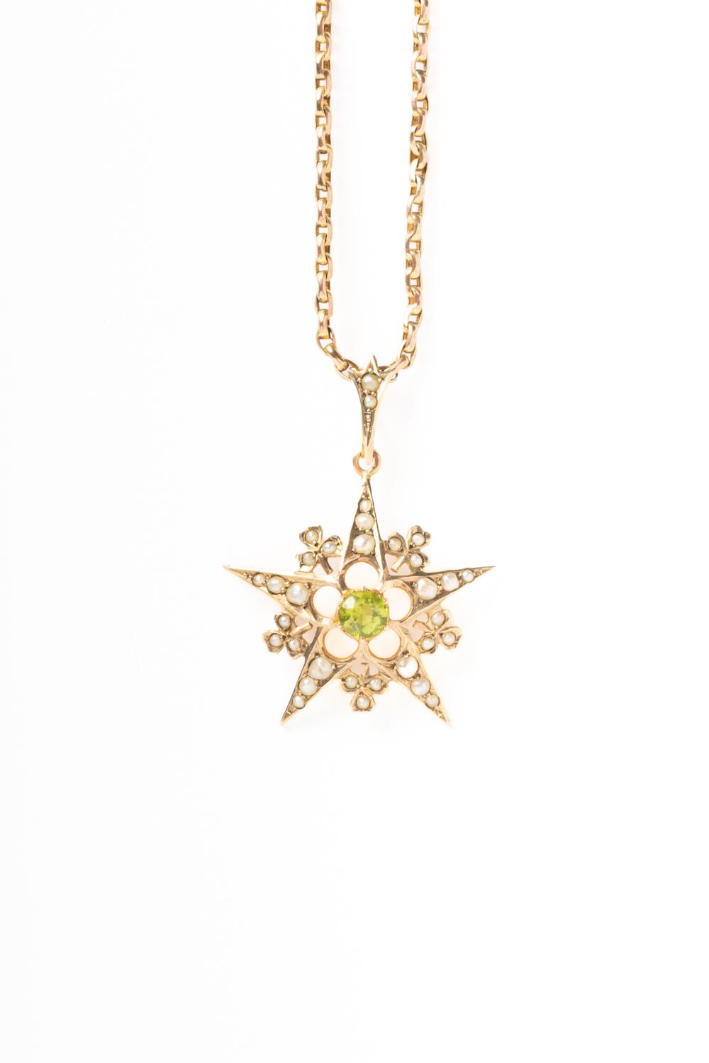 Edwardian 9ct Gold Peridot & Pearl Starburst Necklace