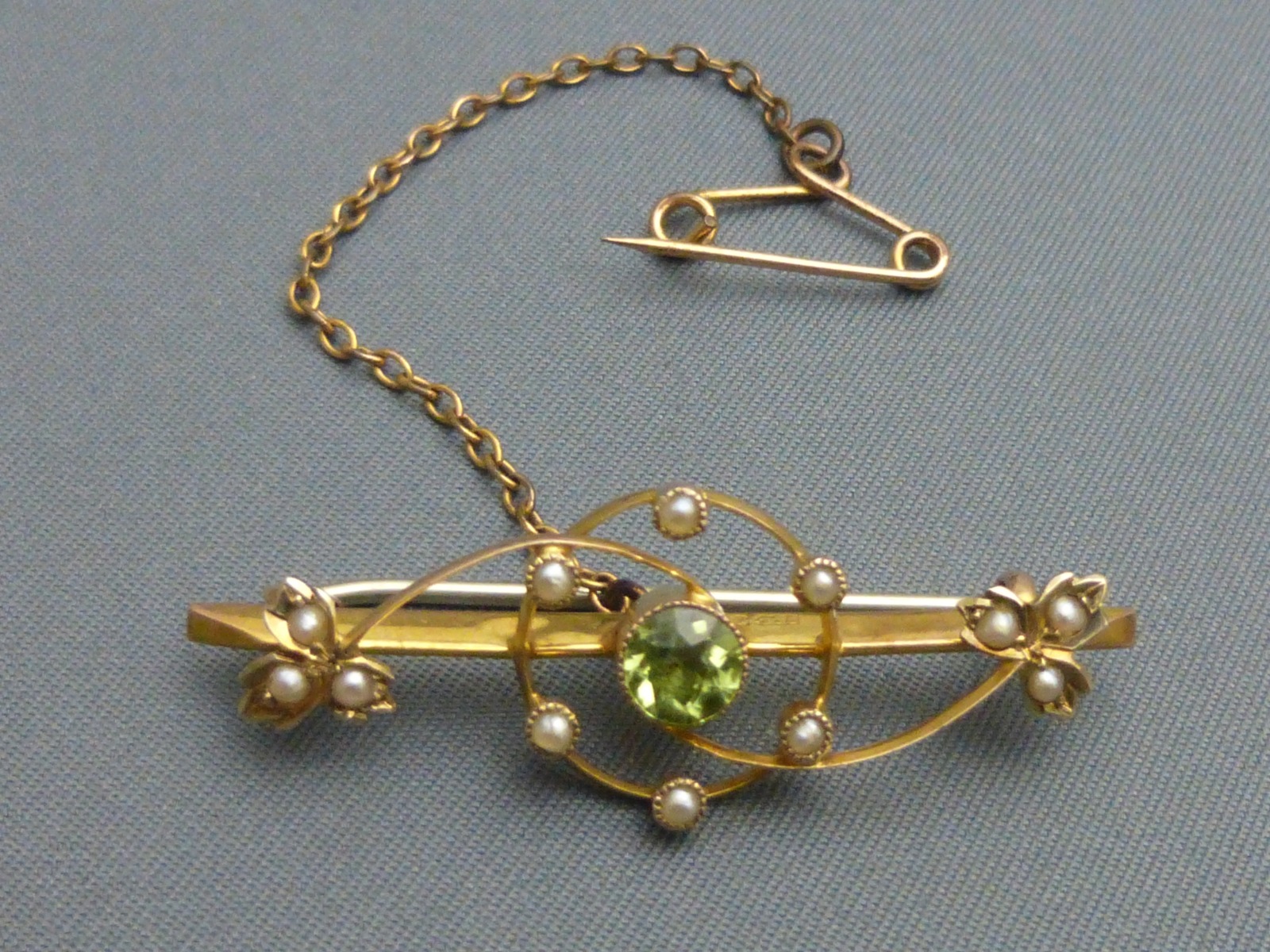 Edwardian 9ct Gold, Peridot & Seed Pearl Brooch